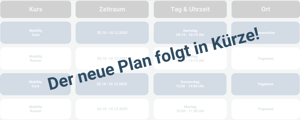In meinem Mobility-Programm erwartet dich ein abwechslungsreicher Mix aus verschiedenen Elementen. Übungen aus dem Yoga sorgen für mehr Beweglichkeit, Stabilität und Körperwahrnehmung. Ergänzt wird das Ganze durch meine Erfahrungen aus der Leichtathletik sowie turnerische Elemente, die gezielt Kraft, Kontrolle und Bewegungsfluss fördern. So entsteht ein ganzheitliches Training, das den Körper in all seinen Bewegungsrichtungen anspricht.